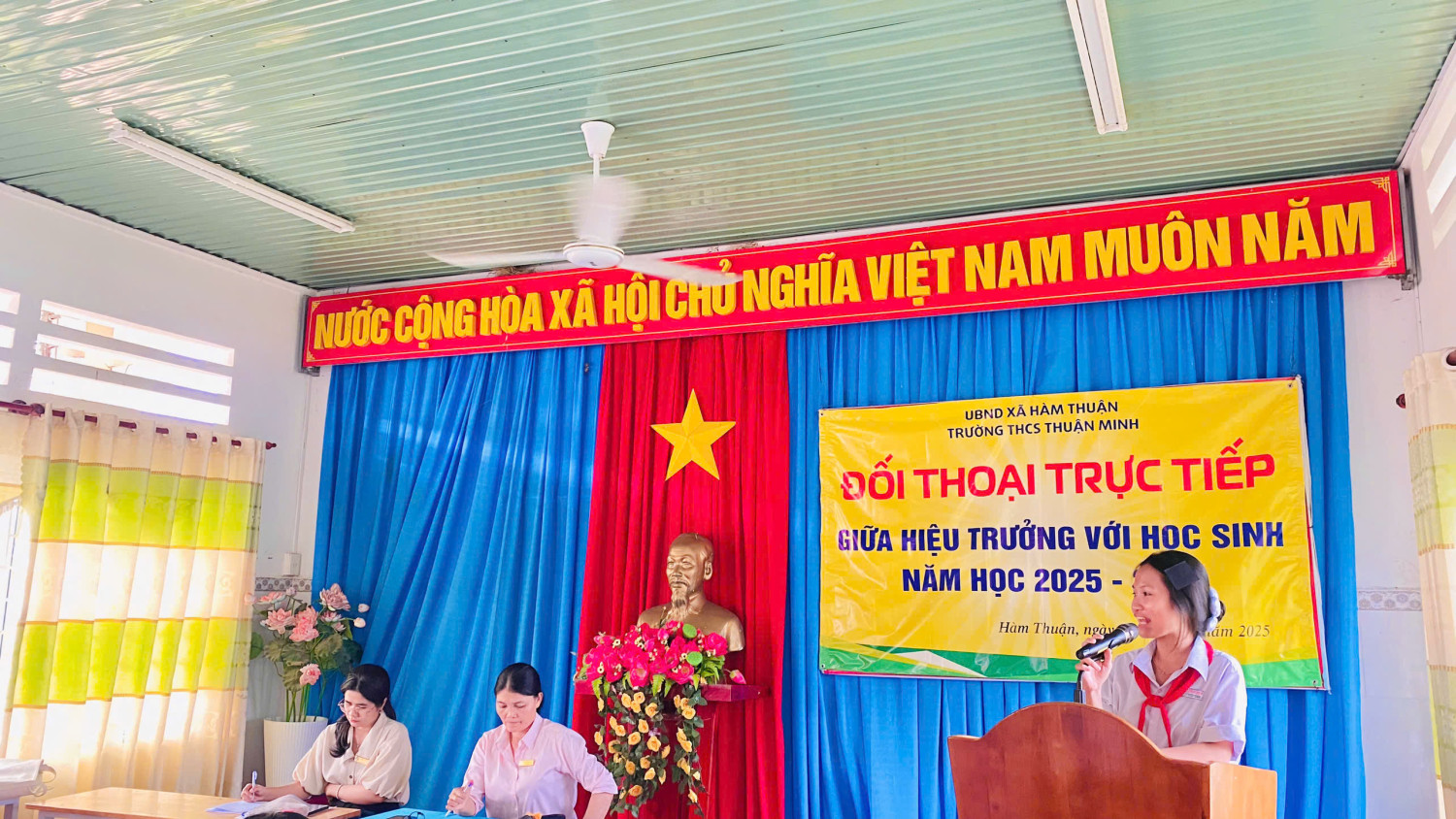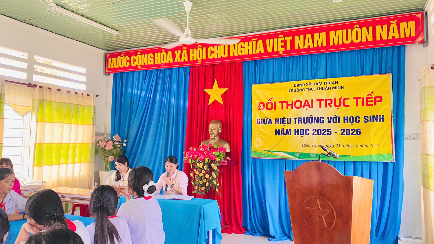 Thực hiện chủ trương xây dựng trường học hạnh phúc, phát huy dân chủ trong nhà trường và tạo cơ hội để học sinh được bày tỏ tâm tư, nguyện vọng, chiều ngày 23/10/2025, Trường THCS Thuận Minh đã tổ chức buổi đối thoại giữa Hiệu trưởng và học sinh năm học 2025–2026 tại phòng Hội đồng giáo viên.