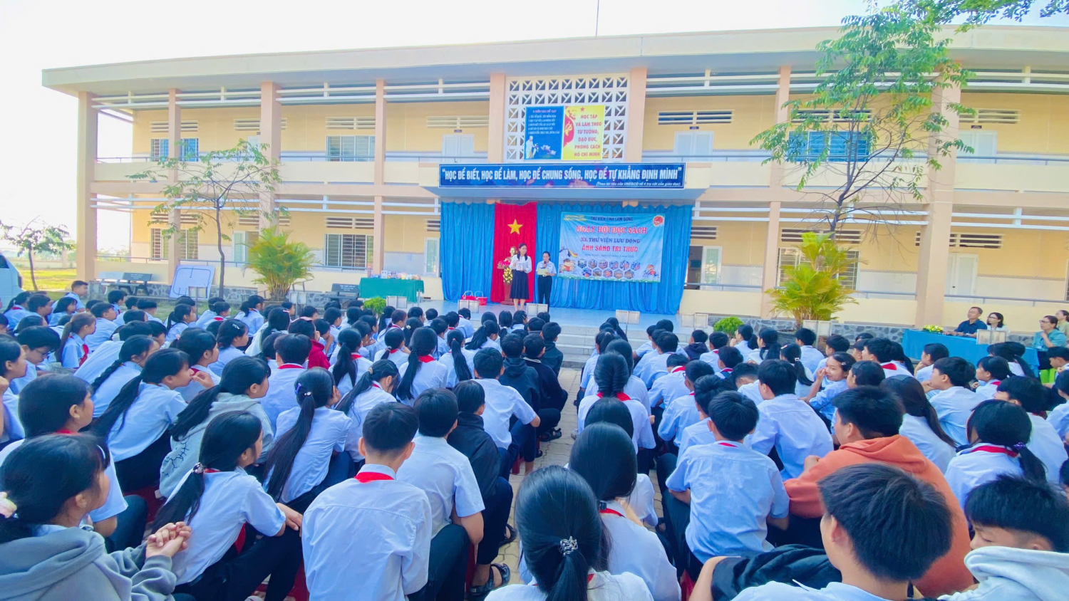 Ngày hội mở đầu là phần phát biểu của đại diện nhà trường và Thư viện tỉnh, nhấn mạnh vai trò quan trọng của sách trong việc phát triển tri thức và nhân cách học sinh.